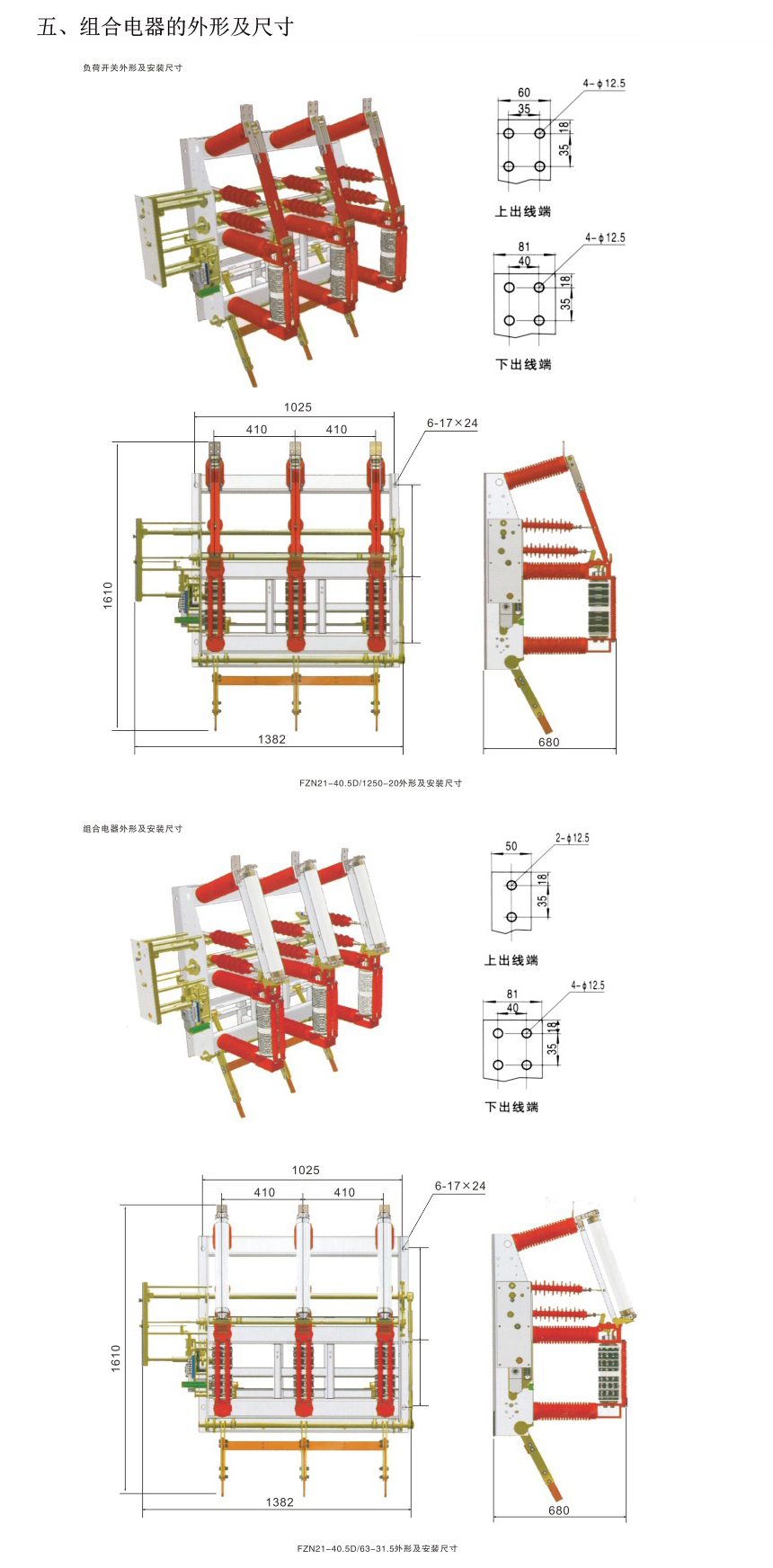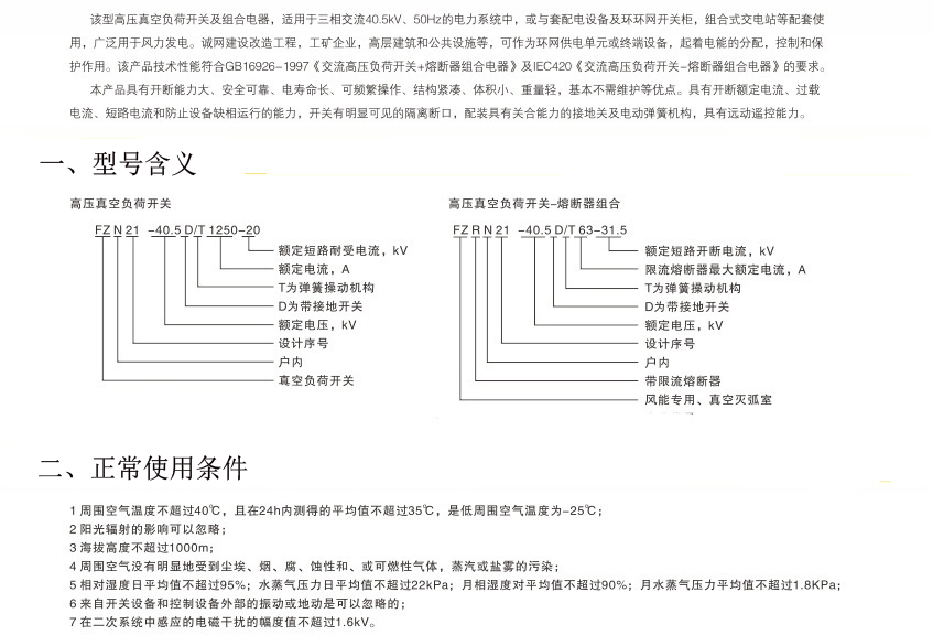 FZN21-40.5/T1250-20 戶內(nèi)交流高壓真空負荷開關 FZN21-40.5D/T1250-20 帶接地開關戶內(nèi)交流高壓真空負荷開關 FZRN21-40.5/T630-31.5 戶內(nèi)交流高壓真空負荷開關-熔斷器組合電器 FZRN21-40.5D/T630-31.5 帶接地開關戶內(nèi)交流高壓真空負荷開關-熔斷器組合電器 注: 真空負荷開關的絕緣子可選配帶電顯示器的傳感器。