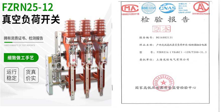 FFZN25、FZRN25型真空負荷開關和組合電器在靜觸頭與動導電筒之間有耐高溫、強絕緣、且阻燃的透明玻璃罩、有效地保障了設備安全運行和人身安全。負荷開關與接地開關設有可靠的機械連鎖,既保證了安全又方便了檢修。