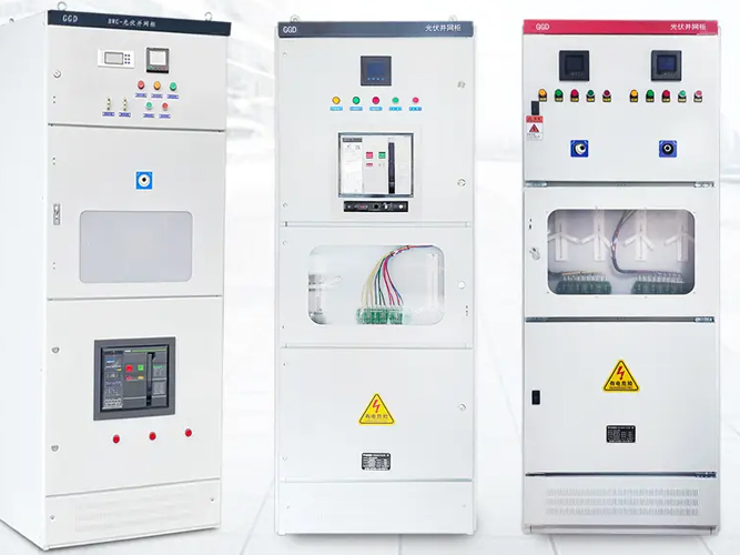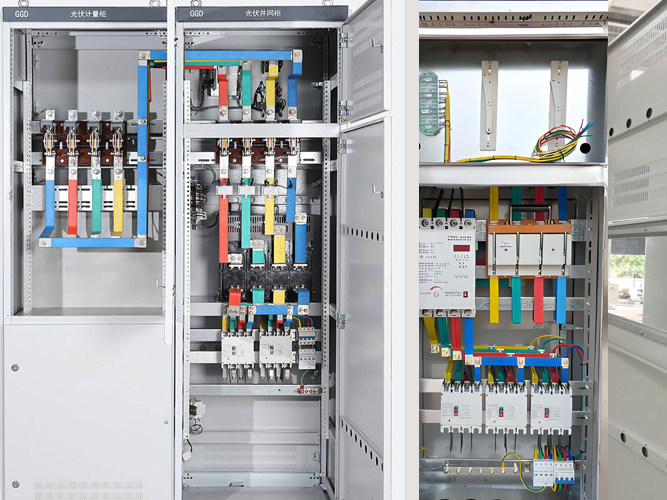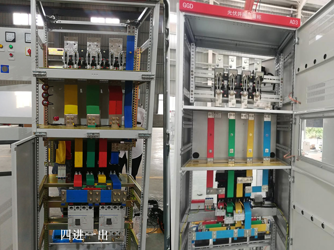 GGD光伏并網(wǎng)柜光伏發(fā)電系統(tǒng)交流并網(wǎng)配電柜適用于太陽(yáng)能光伏并網(wǎng)發(fā)電系統(tǒng),作為光伏逆變器與升壓變壓器或負(fù)載之間的電能轉(zhuǎn)換、分 配與控制之用, GGD 光伏并網(wǎng)柜作為光伏電站的總出口存在于光伏系統(tǒng)中,是連接光伏電站和電網(wǎng)的配電裝置,其主要作用是作為光伏發(fā)電系統(tǒng)與電網(wǎng)的 分界點(diǎn)。對(duì)于低壓并網(wǎng)的光伏電站,光伏并網(wǎng)柜中還可以加裝計(jì)量、保護(hù)等功能器件。