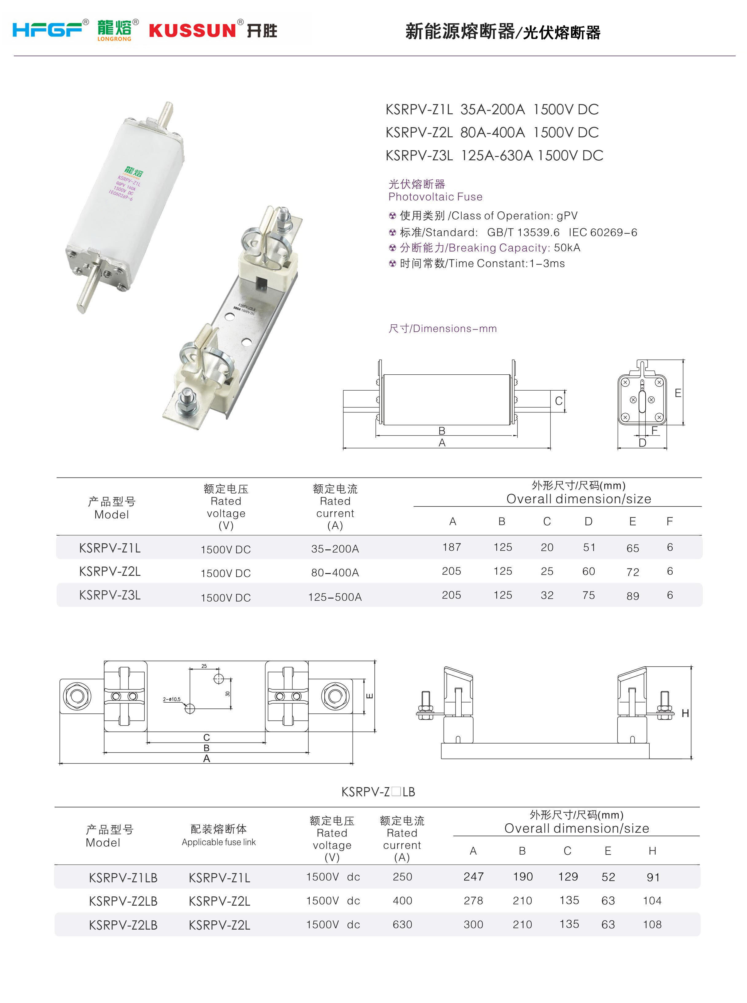 • KSRPV-Z1L 1500VDC系列光伏熔斷器 刀座式/新能源熔斷器